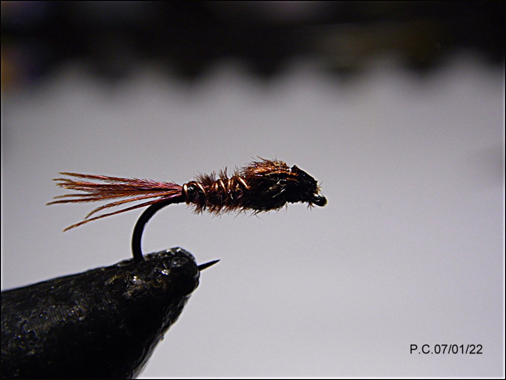 Nymphe passe partout en dubbing, poil de lièvre olive et noir montée sur un hameçon JIG (la pointe se retrouve en haut sous l’eau et limite les accrochages).